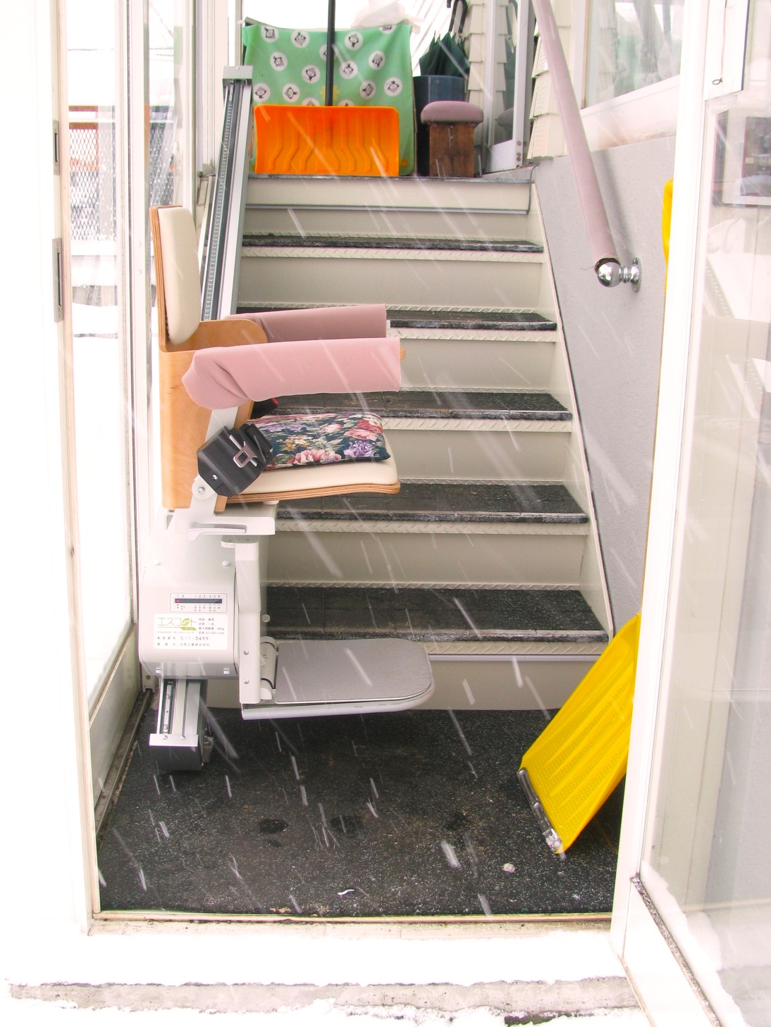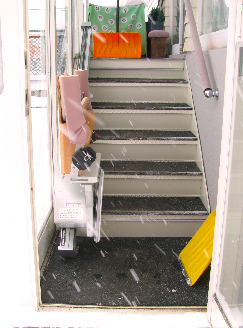 しかし、本体や工事費などを含めるとおおよそ500万円以上かかることから、玄関フード内の外階段にいす式階段昇降機を設置する方法に変更されました。