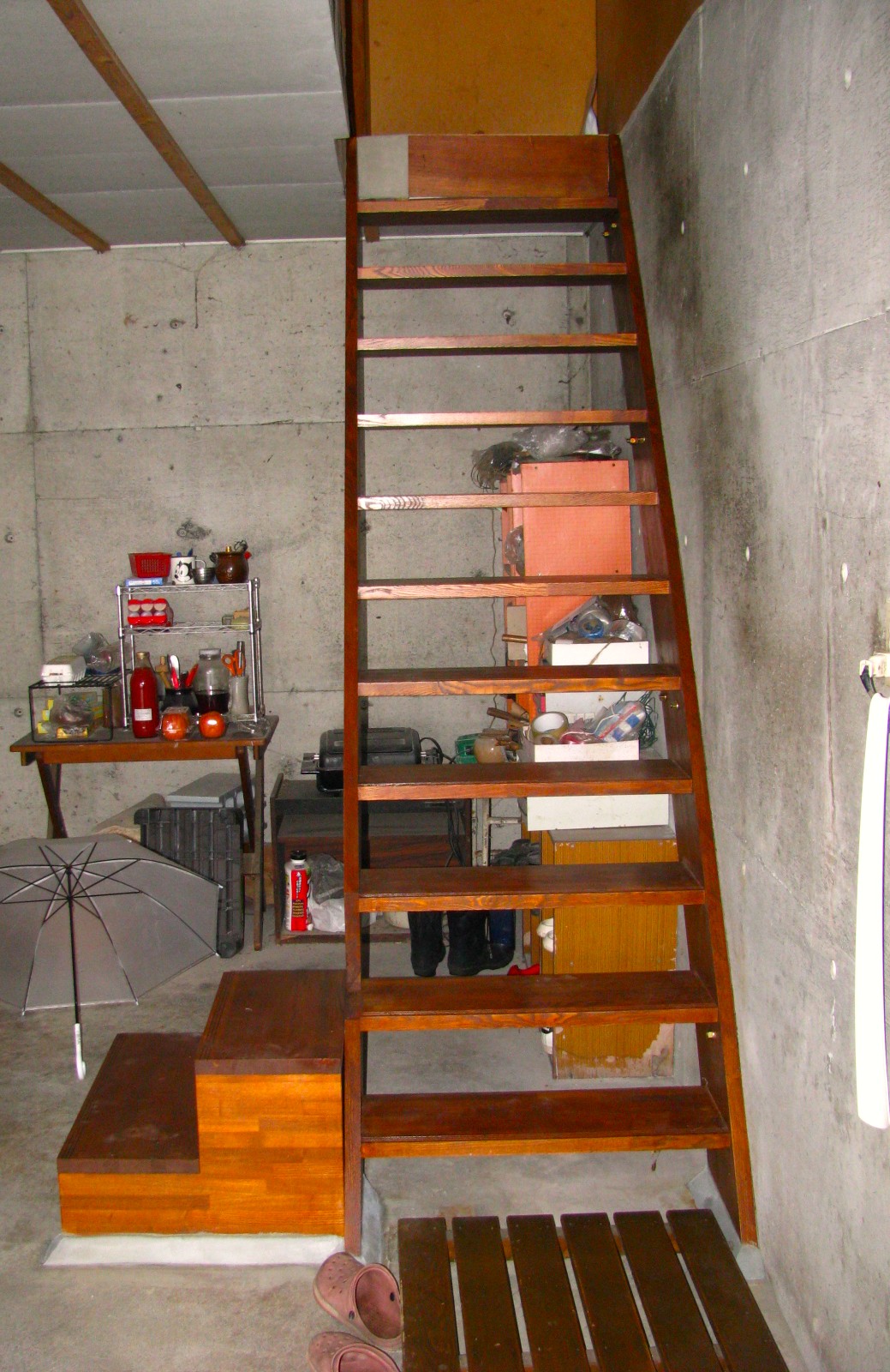 車庫内には飲み物などをストックしているとのことで、今後はそれらの荷物も階段昇降機を使って上げ下げされるとのことです。