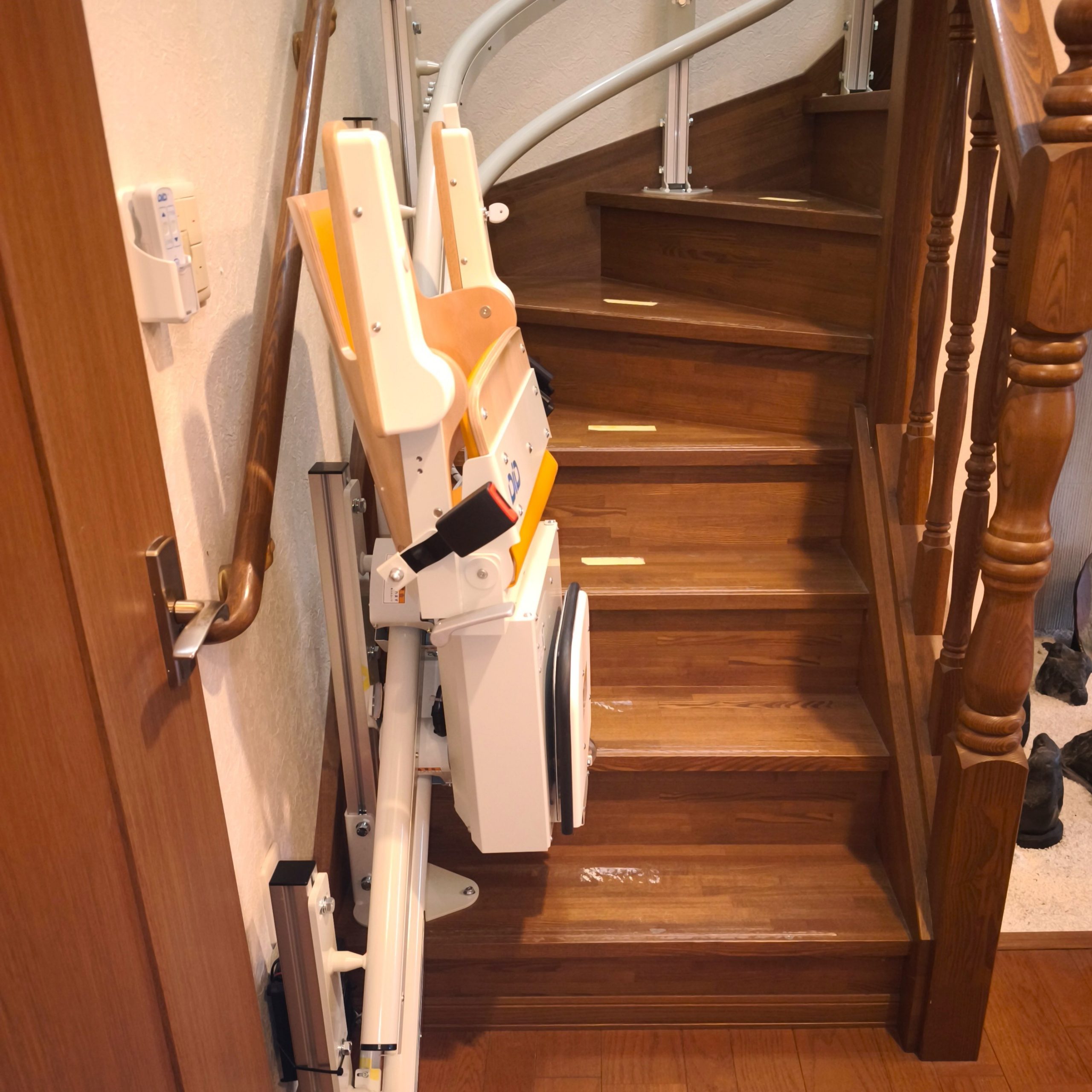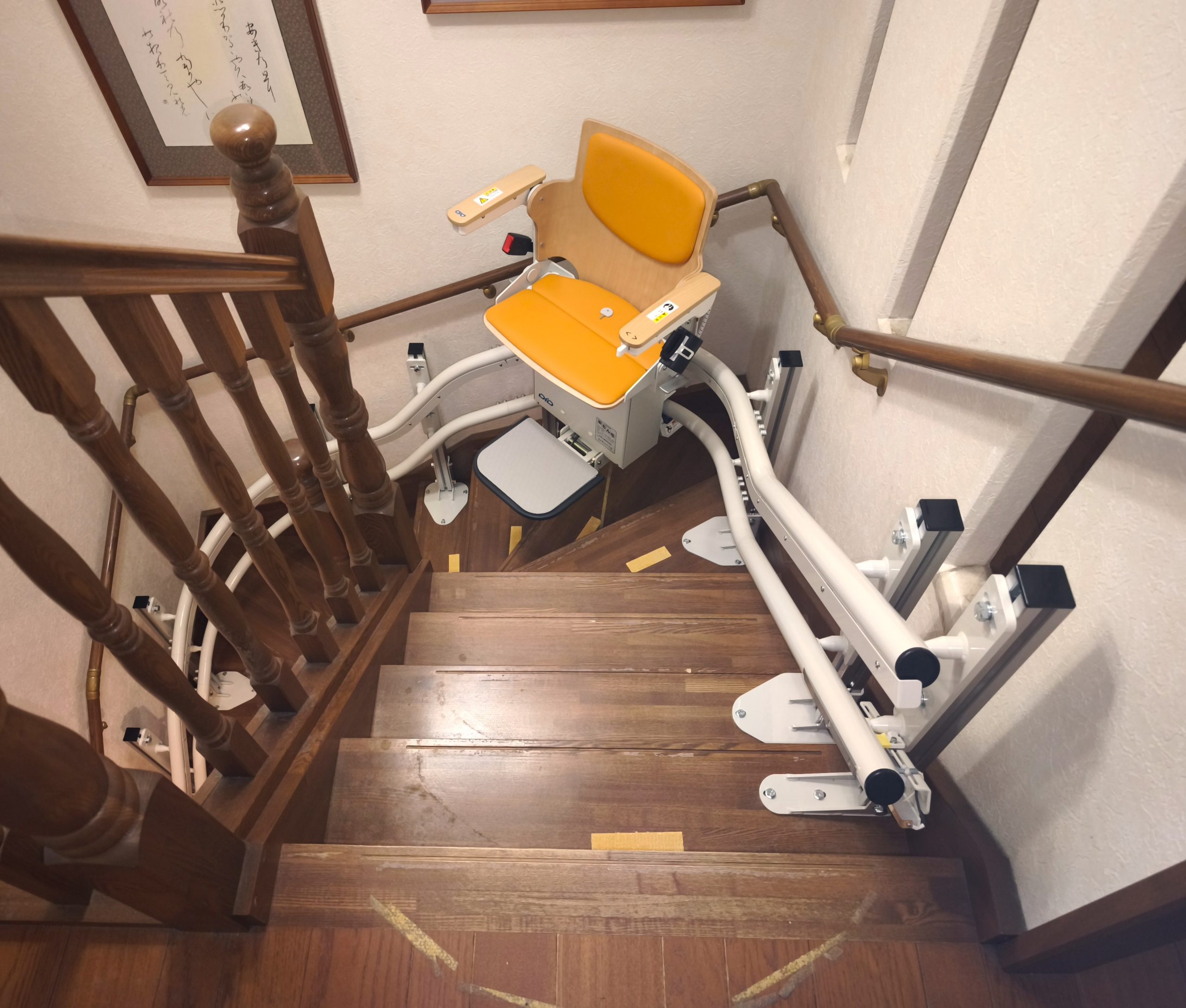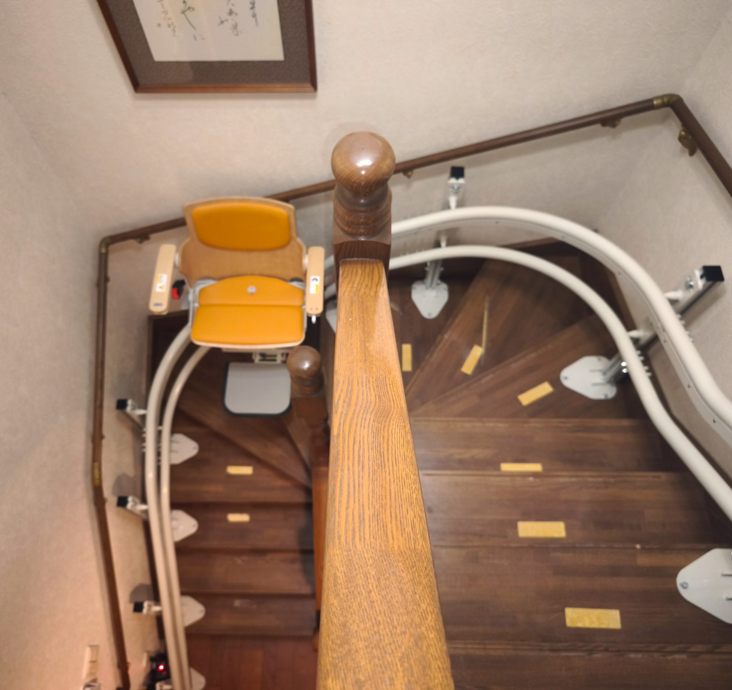 ご主人が手すりを使って安全に上り下りできるように、手すりを残した状態でいす式階段昇降機を設置しました。