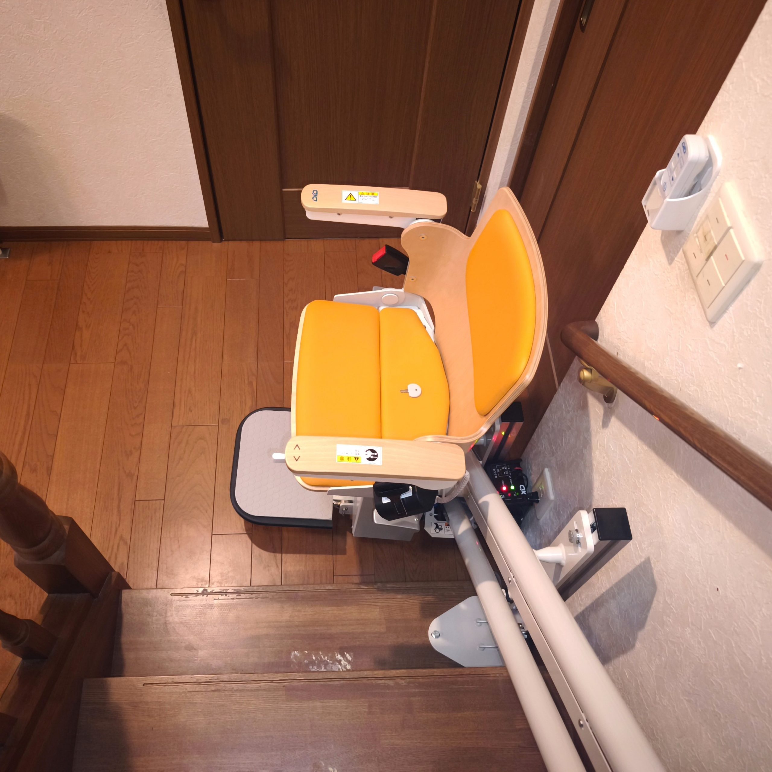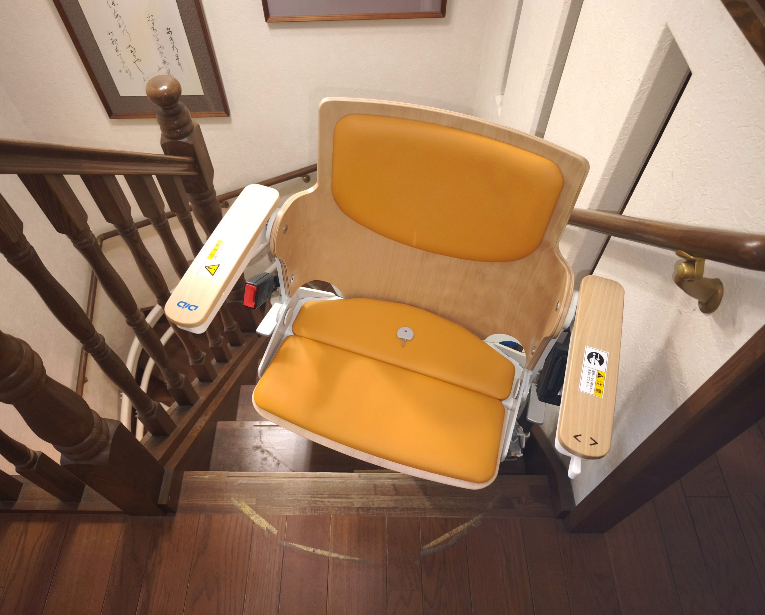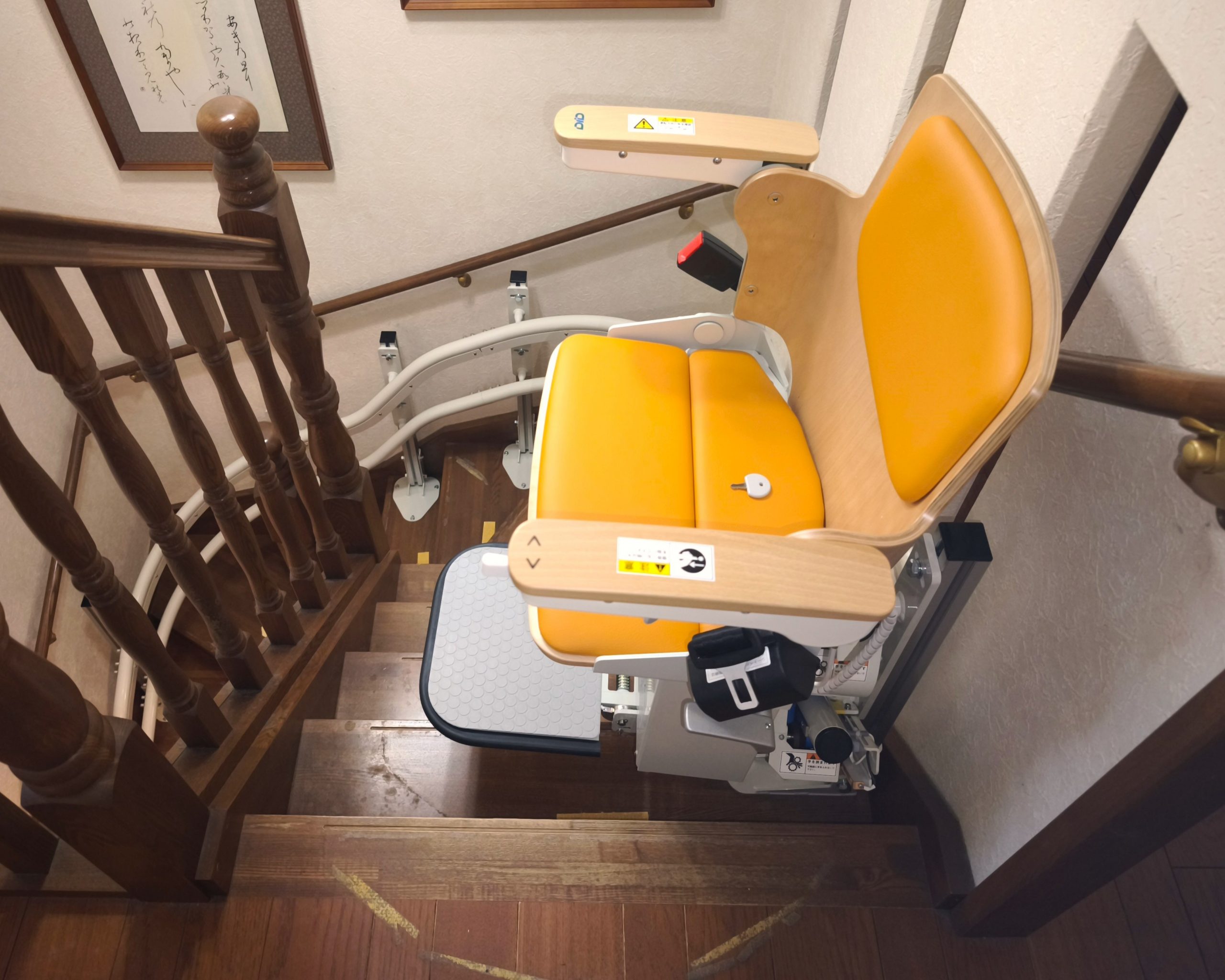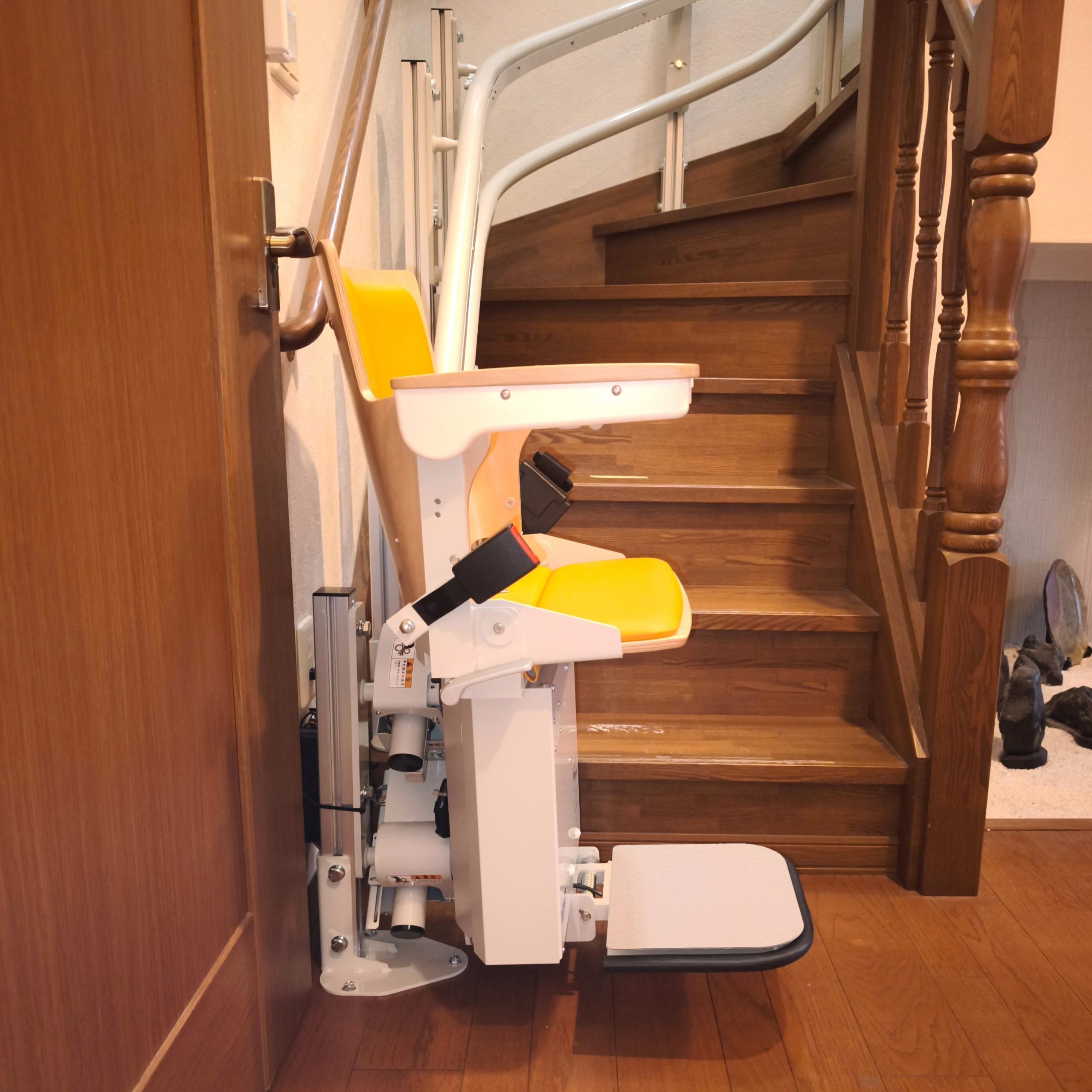 ご主人が手すりを使って安全に上り下りできるように、手すりを残した状態でいす式階段昇降機を設置しました。