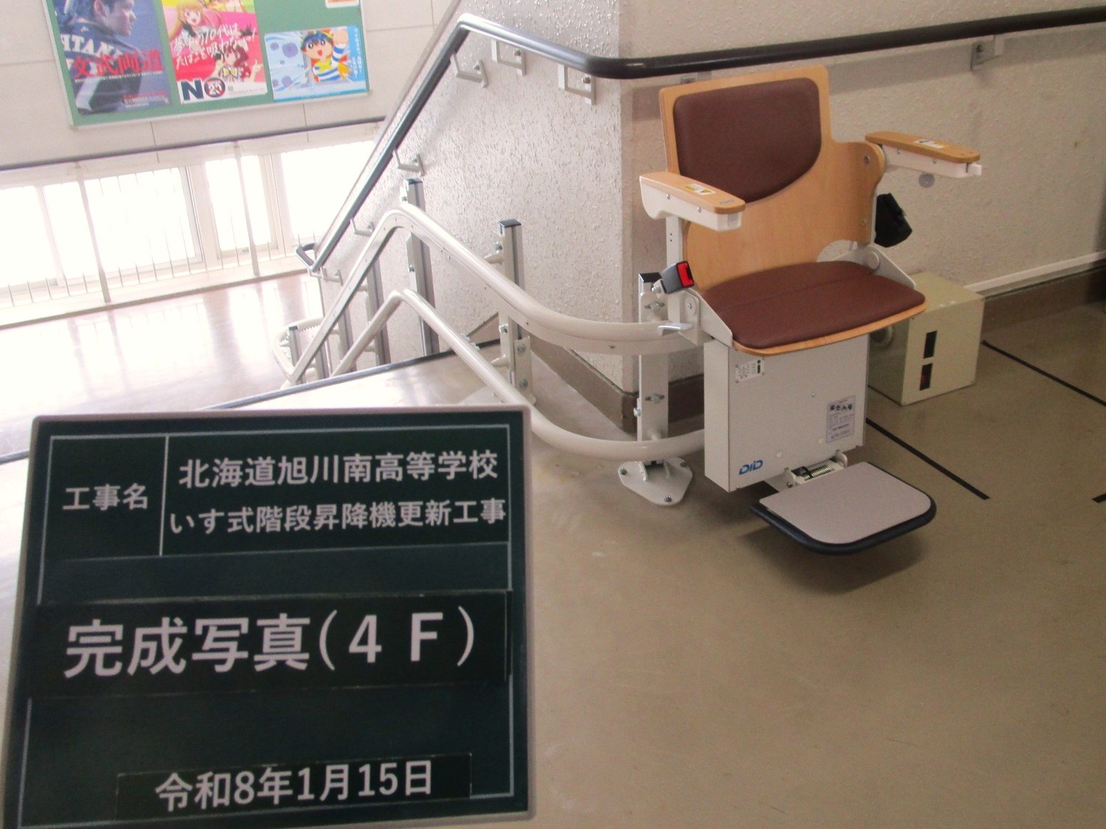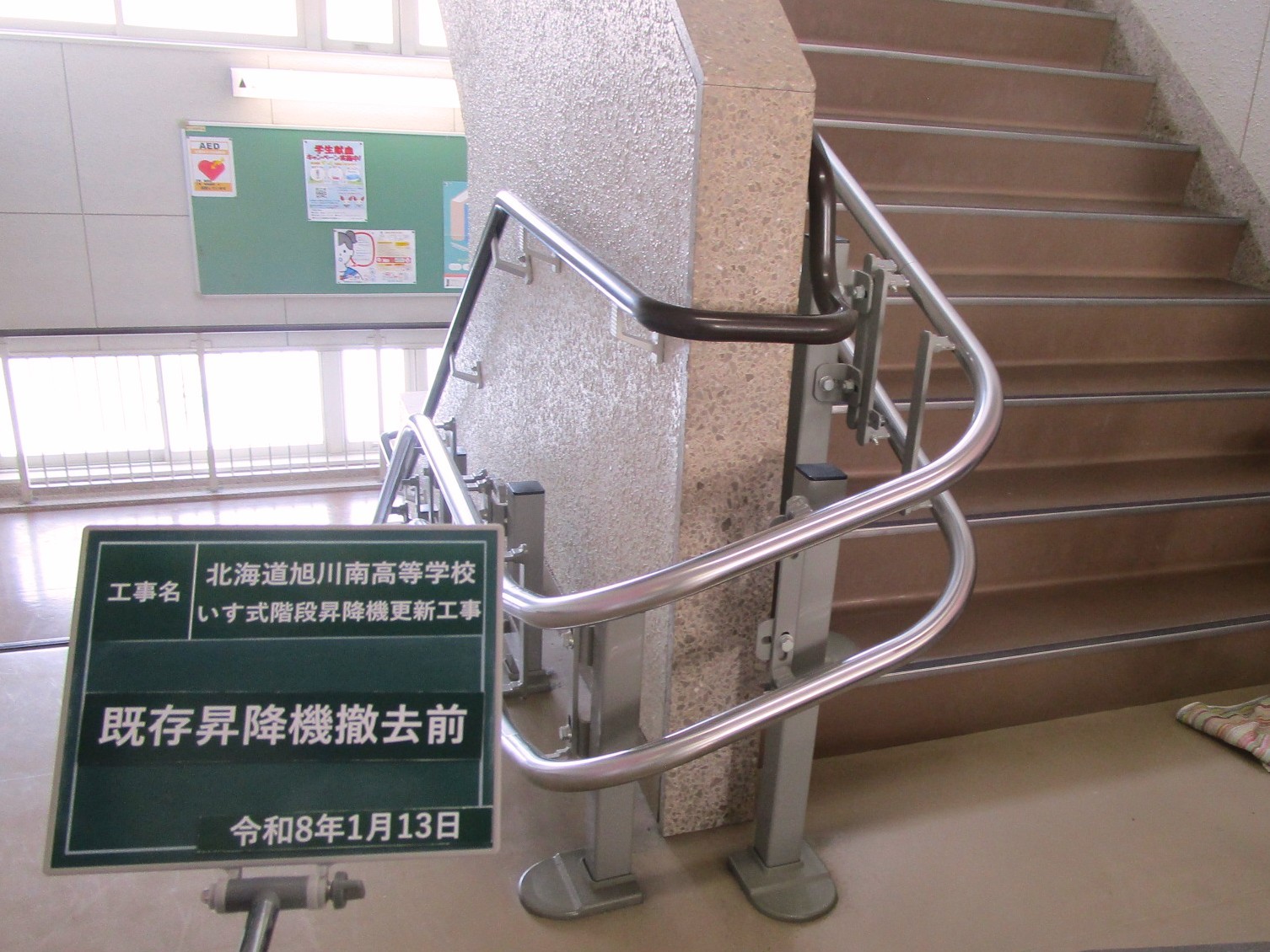 同校は2009年に、すべての生徒が各教室へ無理なく移動できるようにするため、1~4階・4階~5階への階段にいす式階段昇降機を設置しました。