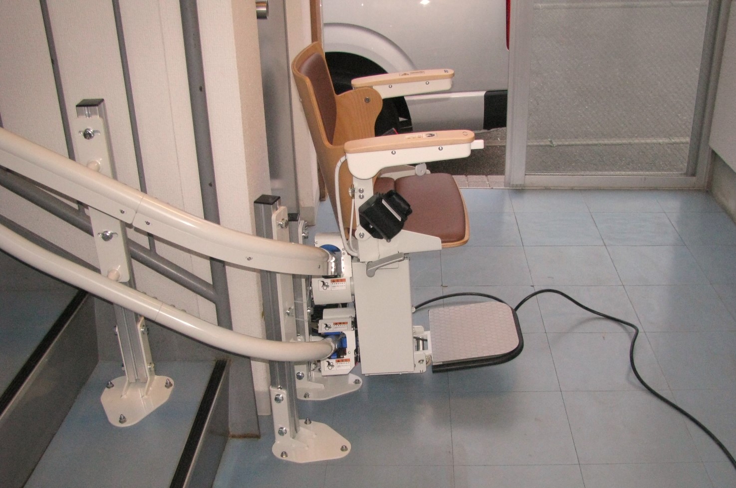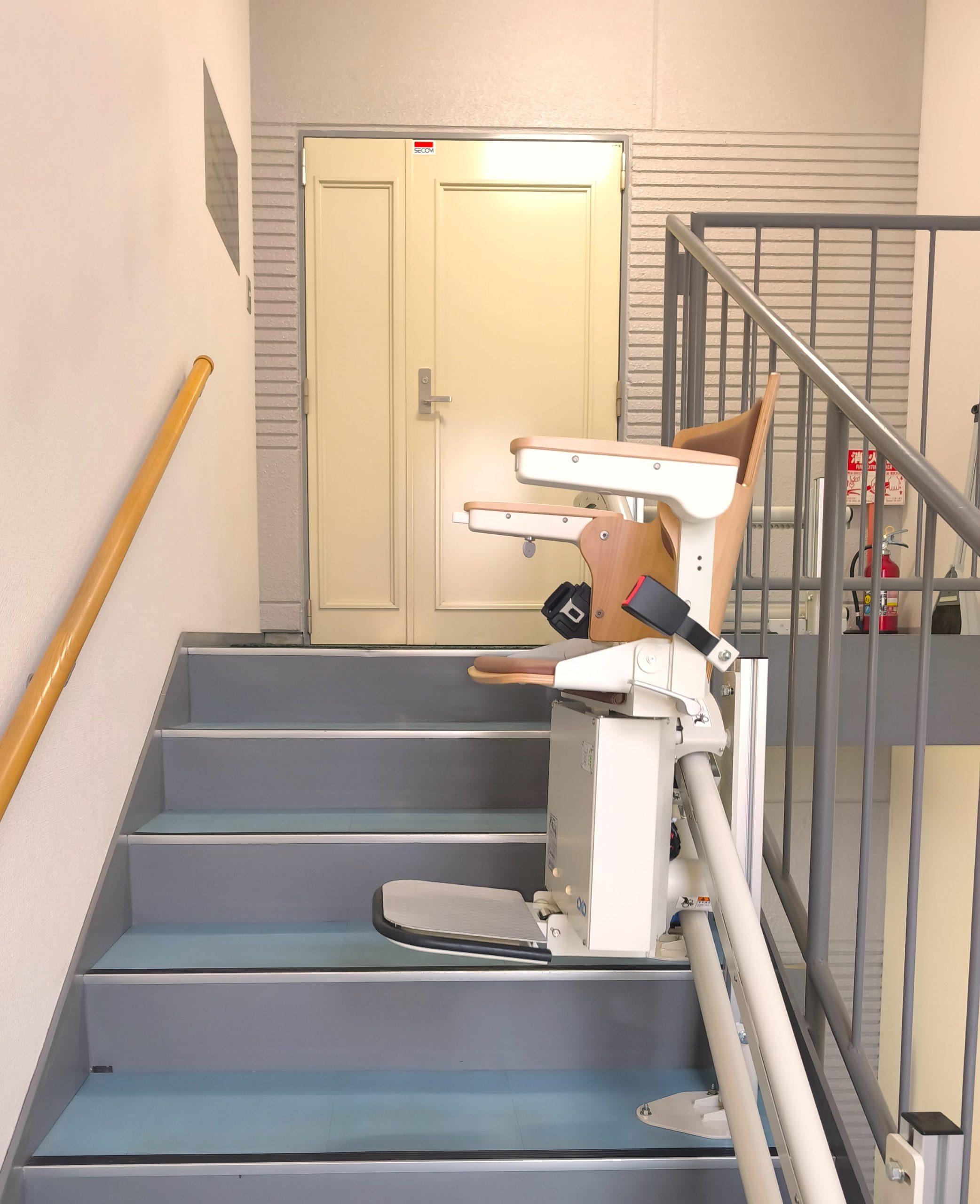 今回の社屋は3階建てで、1階から3階まで続く階段には複数の折り返しがあるため、曲線階段に対応できるこの機種を選択しました。