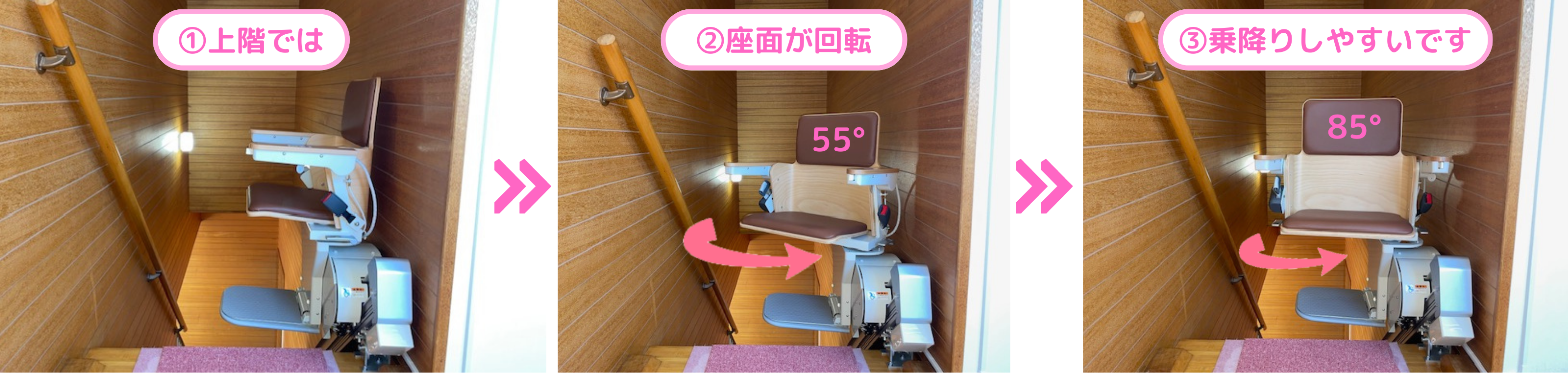 階段上階では乗り降りが安心・安全にできるよう2段階で回転します。
